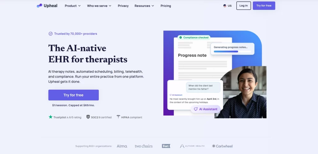Upheal positions itself as the AI-native alternative in this category. Where other platforms have added AI features onto existing architectures, Upheal built its entire workflow around AI from day one. The platform’s session recording and automated note generation capabilities are among the most sophisticated available, producing structured summaries, treatment plan updates, and outcome tracking from recorded sessions. For therapists spending significant time on documentation, this approach represents a genuine shift in efficiency.