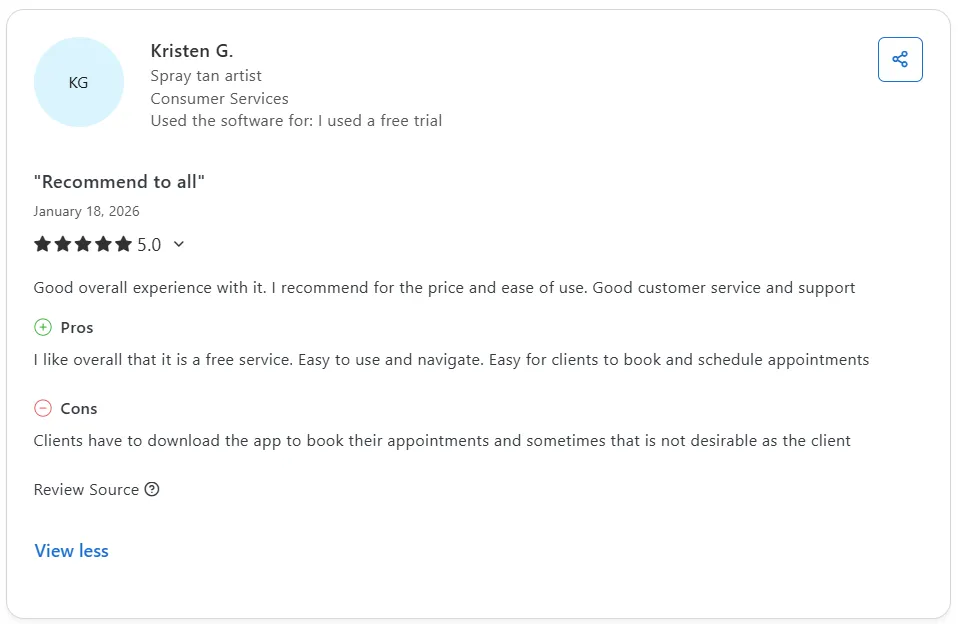 Reviewers also appreciate the professional look, simple setup, and time-saving features like online booking, calendar management, and notifications.