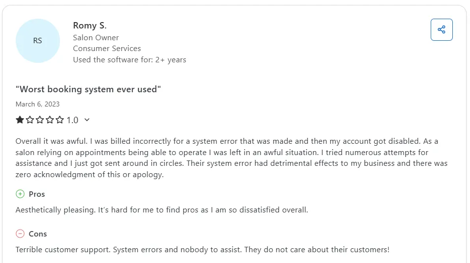 Others highlight difficulties exporting client data, unclear cancellation terms, and limited support during critical problems. These issues are especially concerning for businesses that rely heavily on consistent scheduling and responsive support to operate smoothly.