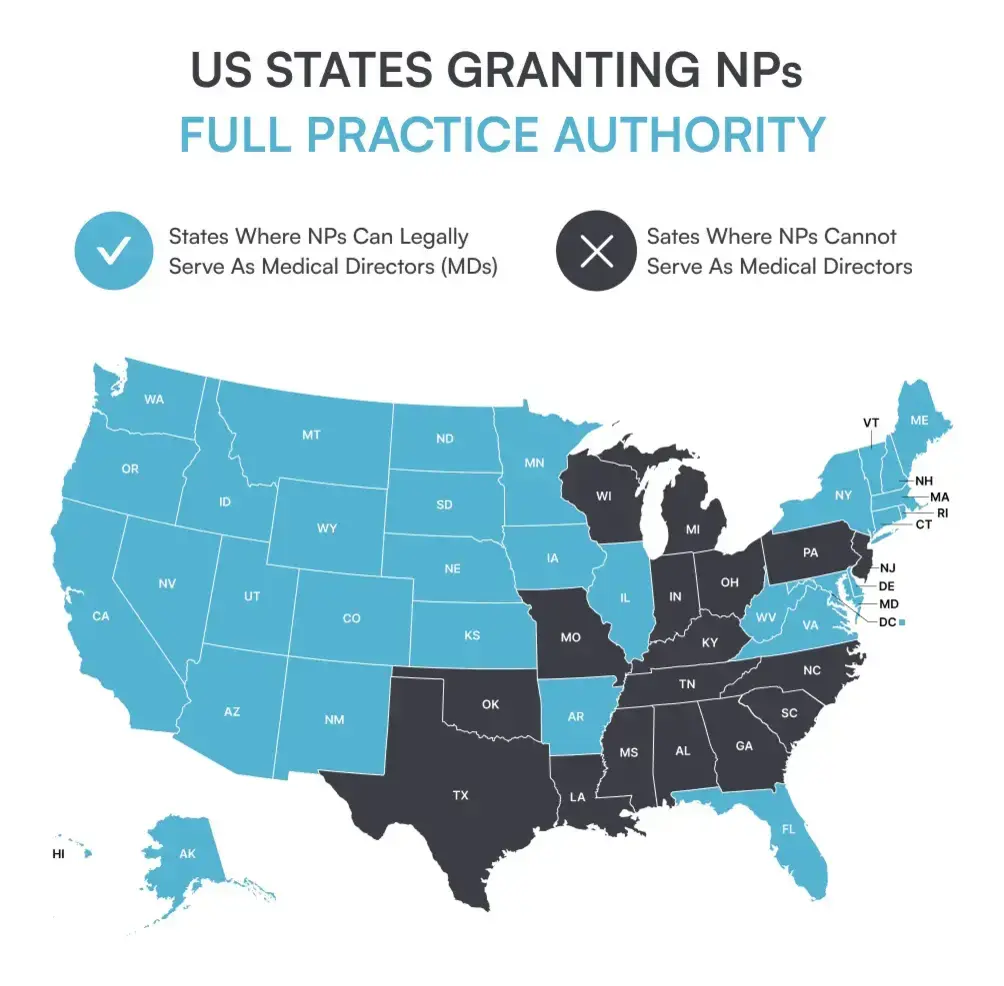 Gone are the days when only physicians could call the shots in medical leadership. Now, nurse practitioners (NPs) don’t just want to treat patients. They’re also eyeing leadership roles like medical directors.The question is whether NPs are legally allowed to step into this role.The answer isn’t always straightforward. It depends on where NPs want to practice and how that state regulates medical spa leadership and oversight.In this blog, we’ll explore the current regulatory landscape and the options available for ambitious NPs who want to become medical directors. What does a medical director do in a med spa? If you’re considering becoming a medical director (MD) at a med spa, the first thing to know is that the role involves overseeing the clinical side of the business to ensure treatments are safe, legal, and meet professional standards.Let’s take a look at the scope of practice and responsibilities MDs have:🗸 Clinical oversight: Supervising treatments and ensuring they meet safety and quality standards🗸 Staff leadership: Recruiting, training, and mentoring a well-coordinated and skilled team🗸 Staying on top of regulatory requirements: Stay on top of state laws and regulations to keep the business aligned with them🗸 Setting policies: Creating and updating operational policies for smooth daily operations🗸 Managing resources: Keeping an eye on the budget, staff resources, and ensuring the practice stays efficient without cutting corners🗸 Growth strategies: Collaborating on growth strategies, including marketing and technology, to ensure the business is as profitable as possible Legal and compliance responsibilities Due to their variety of responsibilities in healthcare practices, medical directors carry a lot of legal accountability as well, such as:Liability: If something goes wrong — a botched procedure, adverse reaction, or a member of staff turns out to be unqualified to practice — the medical director is often held legally responsible. Patient safety: Medical directors are legally responsible for patient safety, which means they must review treatment plans, oversee equipment use, and ensure staff follow proper protocols during appointments.Compliance oversight: MDs must ensure the clinic meets state and federal regulations, the spa is licensed, staff are certified to carry out the treatments, and patient records remain secure and confidential. Day-to-day duties of a medical director At medical practices, a director of medicine has a multitude of responsibilities. Here are some of the routine daily tasks they typically face:Working with other healthcare professionals, management, and administratorsReviewing treatment approvalsProtocol development to align with the medical governing bodiesMonitoring of the activities of medical staffEnsuring robust patient record-keeping processesIn short, the medical director’s role is the driving force of a medical spa, as it ensures the team is on track, patients are safe, and the spa stays compliant. Can a nurse practitioner be a medical director? There’s no straightforward answer with ‘yes’ or ‘no’ as it depends on the state. Some states give NPs full freedom to be medical directors, while others still require a physician’s oversight.According to the American Association of Nurse Practitioners (AANP), in the states where NPs are allowed to act as medical directors, they are authorized to;Diagnose patientsOrder and interpret diagnosesInitiate and manage treatmentsPrescribe medicationsThis level of independence is known as Full Practice Authority (FPA). States where NPs can be medical directors According to the American Med Spa Association, some of the states that allow NPs to serve as medical directors are:AlaskaArizonaArkansasCaliforniaColoradoConnecticutDelawareWashington, D.C.The rest of the other states that legally allow NPs to work as MDs are shown in the image below. What if you’re in a state where NPs can’t be medical directors? Just because an NP can’t hold the title of medical director doesn’t mean they can’t own or operate a medical spa. Here are some alternative pathways: 🤝Partnering with a medical director In restrictive states where NPs aren’t allowed to act as medical directors, they must work around regulations by partnering with a physician. Start by thinking about the kind of medical director you want — perhaps think of some medical director interview questions you’d ask if they were to interview with you. Then, you can proceed with:Research on state requirements: Medical director requirements vary by state. To be sure, check your state’s medical board website or consult a healthcare attorney for the specific qualifications and licensing needed.Network at industry events: Share the news that you’re looking for an MD by attending local conferences or workshops, like The Medical Spa Show or Aesthetic Boot Camps, to connect with industry professionals.Leverage online sources: Explore online physician directories like DoctorFinder or Doximity to look for board-certified physicians in your area.Set up a contract: Outline responsibilities and compensation strategiesEnsure compliance: Comply with state regulations on medical ownership To successfully hire a medical director, you’ll need to carefully evaluate these steps and ensure that you meet all the legal and practical requirements. 🌟Alternative leadership roles for NPs in med spas Even if some states don’t allow NPs to operate as medical directors legally, there are still options for them to take on med spa leadership roles, such as:Co-owners or a managing partner of the med spaA clinical director who supervises the treatments and med spa protocolsAn advanced aesthetic educator/mentor These roles allow NPs to take charge, grow their careers, and still significantly impact a med spa’s success — without having to be a medical director. How to ensure compliance when operating a med spa No matter your role