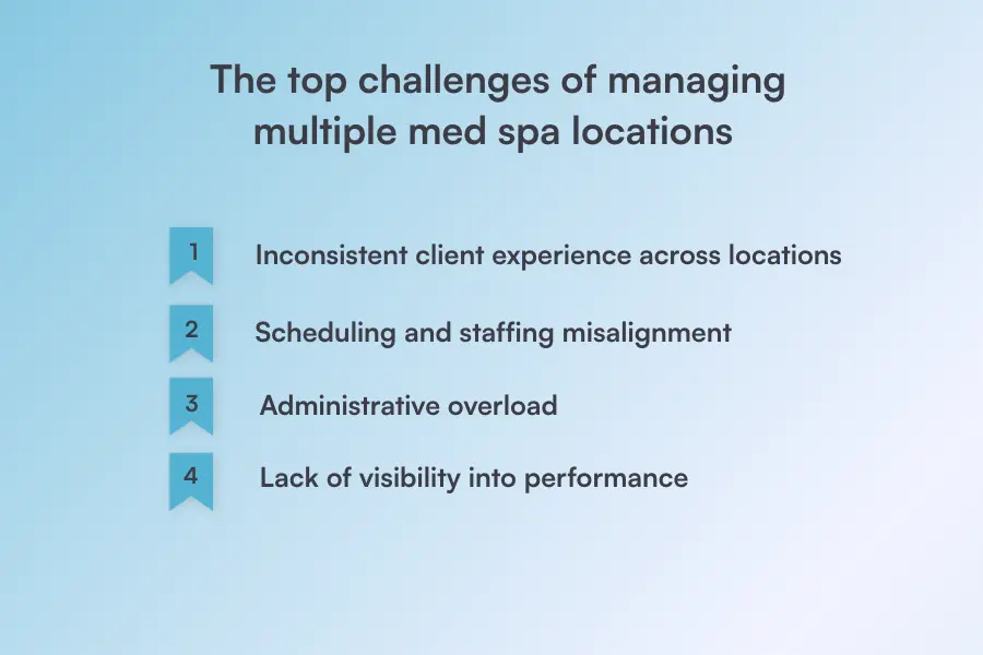 Running one medical spa is no small feat. So if you’ve expanded to multiple locations, first off, take a moment to acknowledge how far you’ve come. Growth like that doesn’t happen by accident. It’s a sign of your vision, dedication, and hard work, increasing your client retention, trust and profitability.But if you’re struggling with inconsistent operations, team misalignment, or lack of visibility across locations, you’re not alone. Many med spa owners reach this point and realize their once-reliable systems are starting to crack under the pressure.The good news? These challenges are solvable. In this blog, we’ll walk through the most common roadblocks multi-location med spas face — and how to overcome them with clarity and confidence. What makes running multi-location med spas so challenging? Running multi-location med spas is a sign that your med spa services resonate with clients and that your business plan works. But a new location comes with a new layer of complexity, and often, a new set of headaches.Suddenly, you’re not just managing one team or process — you’re juggling multiple teams, schedules, tools, and client expectations, all while trying to keep the same high standards across every location. It’s a lot to coordinate, and it can get overwhelming quickly.The systems that once worked smoothly for a single site often start to show their limits as you grow. Without optimizing your operations, disconnected tools, misaligned teams, and inconsistent workflows can lead to confusion, delays, and uneven client experiences.The right practice management setup can make a big difference. But first, let’s look at where things usually start to go off track. The shift from single-site to multi-site operations When you’re running one location, it’s much easier to stay close to the day-to-day. Communication is direct, decisions are quicker, and you can spot problems before they snowball.But once you add more locations, everything multiplies — staff, clients, schedules, tools, and even your marketing strategies. Without systems that offer the right functionality to support multi-site operations, you might find yourself dealing with:Fragmented communication between teams and sitesInefficient or mismatched tech tools that don’t talk to each otherInconsistent workflows that lead to errors, delays, or uneven client experiencesWhat used to feel manageable can quickly become chaotic, especially when every site is doing things a little differently. Who this affects — and why it matters These challenges don’t just land on your desk as the owner or director — they ripple across your entire organization.Practice managers may struggle to enforce standards or keep teams alignedFront desk teams may get frustrated with unclear protocols or clunky toolsClients might feel the difference in experience from one location to anotherAnd staff turnover can rise when teams feel unsupported or out of syncIn short, the impact of operational misalignment touches every part of your business, from how happy your clients are to how fast you can grow.The good news? Once you identify where the gaps are, you can start to close them with systems and processes designed to support growth, not fight against it. The top challenges of managing multiple med spa locations Scaling up to more than one location should make your life easier, not harder. But for many med spa owners and managers, it can feel like the opposite. More sites come with more moving parts — and if they’re not all working together, things can get messy, fast. Source: Pabau Here are the top challenges that tend to pop up, and what they really look like behind the scenes. Inconsistent client experience across locations Your clients don’t care how many locations you have, they just want a seamless, polished experience, no matter where they go. But when each site is using slightly different processes, systems, or even scripts, it can quickly lead to brand inconsistency.For example, one location greets clients with warm towels and clear aftercare instructions, while another forgets to confirm appointments or skips follow-ups. These small mismatches can chip away at trust and leave clients wondering, “Am I getting the same quality of care here?”Consistency helps you build trust and show potential clients they’ll get the same great experience, no matter which location they visit. Scheduling and staffing misalignment Coordinating schedules for one team is tricky enough. Now try doing it across multiple locations, possibly in different time zones or with varying hours of operation. Without a unified view of provider availability, double bookings, missed appointments, and last-minute scrambles become way too common.Staff burnout creeps in when schedules feel chaotic or unfair. Team morale takes a hit when people are constantly being asked to cover gaps or deal with frustrated clients. Additionally, gaps in staff training can make things even harder, especially when team members aren’t aligned on systems, protocols, or expectations across locations. Administrative overload Many multi-location med spas rely on a patchwork of tools — one system for scheduling, another for payments, maybe a spreadsheet for tracking inventory. It works… until it doesn’t.According to Qatalog, in collaboration with Cornell University’s Ellis Idea Lab, employees waste about 59 minutes per day searching for information across multiple tools. Illustration: Pabau / Data: Qatalog Additionally, another report from Asana found that 62% of the workday is lost on repetitive and mundane tasks, such as switching between apps, chasing status updates, duplicating work, attending unnecessary meetings, and managing manual processes.Simplifying your tech stack can free up hours of time each week and give you and your team the mental space to focus on what really matters.Because let’s be honest: You didn’t get into this business to babysit spreads