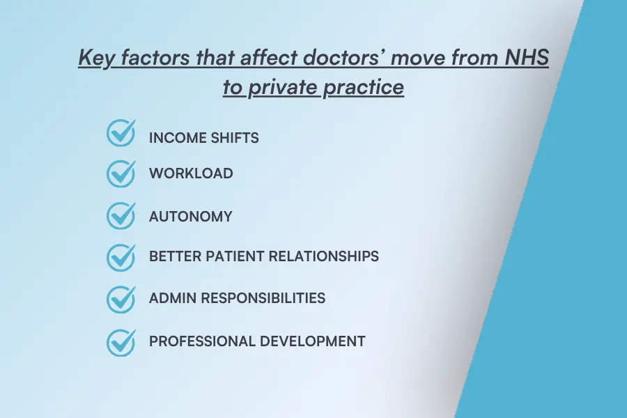 Ask around in almost any primary care setting or hospital corridor these days, and you’ll hear the same. Doctors and nurses are wondering if it’s time to pack in the NHS and try their hand at private practice.And it’s not surprising. Long hours, endless and tedious admin work, and the guilt of rushing through patients in ten minutes flat all contribute to burnout and low job satisfaction.It takes a serious toll on people’s mental health and overall well-being, leaving many frustrated, exhausted, and quietly craving a way to practice medicine on their own terms.Therefore, in this blog, we’ll explore this topic and explain how you can transition from NHS employment to private medical practice. Why GPs consider leaving the NHS The simple answer to this is that the workload in the NHS has ballooned, while resources have shrunk.GPs talk about: 12-hour days that still don’t feel enoughUnmanageable ten-minute appointments and rigid targetsThe constant sense of being behind Illustration: Pabau / Data: Bain & Company In addition, the system itself doesn’t help, leaving healthcare professionals at a breaking point, with many planning to reduce their hours or quit altogether. On the other hand, NHS patients are growing increasingly frustrated with waiting weeks for appointments and are willing to pay for quicker access. For doctors, this demand is fueling the opportunities for growth in the private sector, making private healthcare more viable than ever, offering a better work-life balance and stronger earning potential. How does transitioning from the NHS to private practice affect a doctor’s career? The move from NHS to private practice isn’t just a change of scenery, it reshapes a doctor’s whole career. Here are the key aspects that affect a doctor’s career when it comes to transitioning from the NHS to private practice: Source: Pabau Income shifts: Earnings are tied to patient volume, services offered, and often business Workload: The hours can be more flexible; you may see fewer patients in a day, but spend more time on non-clinical workAutonomy: Doctors often have more say in how they practice, which treatments they offer, and how their clinic operatesBetter patient relationships: With longer appointment times and less pressure to rush with patientsAdmin responsibilities: Taking on tasks like compliance, payroll, and marketingProfessional development: Doctors get more flexibility for specialization and expand the health servicesIn short, those who leap often find more freedom and better pay, but they also discover that the trade-off is taking ownership of every aspect of their practice. Start your own vs. join an existing practice. One of the most significant decisions NHS staff may face throughout their careers is whether to enter the private sector. The typical options for this are: Start their own clinical practice: Have full control, choose the location, branding, services, and setup, but also have full responsibility and face hefty startup costs Buy into a partnership: Gain a stake in an existing clinic, with all the infrastructure already in place, but you’ll have less control over decisionsJoin an existing healthcare provider: You won’t have to worry about handling the admin, marketing, and facilities, but at the same time, you don’t have full autonomy Bottom line: if you want independence and have capital, start your own practice. If you prefer easing into ownership without the stress, join an existing setup. Steps for transitioning from NHS to private practice as a healthcare professional The leap from the NHS to private practice starts with you handing in your notice. But it doesn’t end there, it’s a process. Let’s take a look at the key steps to take to make the transition. Source: Pabau 1. Review your NHS contract before you leave Before making any moves, dig out your NHS contract. This is crucial because many contracts have:Specific notice periods you need to giveRules about secondary employmentClauses designed to prevent conflicts of interestAlso, ensure that your private work doesn’t interfere with your NHS duties, including the use of NHS resources such as staff, equipment, patient lists, or your NHS email for private purposes. Failing to address these issues can lead to disciplinary problems or even legal consequences. 2. Maintain registration and professional standards Leaving the NHS doesn’t mean leaving the rules behind. Also, patients don’t care whether you’re NHS or private. They expect the same standards of professionalism and safety.You still need to be registered with your regulator and continue fulfilling appraisal and revalidation requirements, whether that’s the:General Medical Council (GMC)Nursing and Midwifery Council (NMC)Health and Care Professionals Council (HCPC)Keeping your registration up to date ensures your practice is beyond reproach. 3. Secure appropriate clinical indemnity for private work The moment you start seeing patients in your private practice, you need your own professional indemnity.Providers like the Medical Defense Union MDU or the Medical Protection Society (MPS) specialize in this, offering coverage tailored to private practice risks. This includes:Protection against clinical negligence claims, including legal defense and compensationSupport for disciplinary proceedingsAssistance with coroners’ inquestsLegal advice and representation for professional mattersCoverage for emergency care abroadRun-off cover after retirement to handle past claimsThink of this as your safety net so you can practice without constantly worrying about ‘what if’. 4. Understand CQC registration requirements In the UK, private practices must understand CQC requirements and it’s role and must also register with it before they begin treating patients. The CQC will check if the services you intend to offer meet the safety, quality, and governance standards.If your private practice is based in Scotland, Wales, or Northe