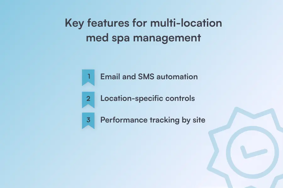 Growing your med spa business from one location to many? That’s a huge step, so congrats are in order! But, managing multiple locations comes with its own set of challenges, like keeping your branding consistent, tailoring marketing for each location, and still delivering the same top-tier wellness experience.This guide is here to make it all a bit easier. Whether you’re just starting to expand or already managing a growing empire, we’ll walk you through practical, actionable tips to help your med spa marketing strategy stay clear, consistent, and effective.And of course, we’ll show you how Pabau can help tie it all together confidently. Understand the unique challenges of marketing multi-location med spas When you’ve got more than one location, marketing gets more complicated. Some of the challenges you might be dealing with:Disconnected brandingInconsistent client communication Duplicate work Struggling to measure what’s actually working whereLet’s look at why these issues pop up, and what you can do to bring it all together in a way that feels scalable, and smart. Why one-size-fits-all marketing doesn’t work Each of your med spa locations has its own vibe, local audience, and maybe even a slightly different set of services. What clicks with clients in a trendy downtown spot might fall flat in a quieter suburban clinic.That’s why “one-size-fits-all” marketing strategies often fail. Your brand needs to stay consistent (same tone, same high standards), but your messaging needs to flex based on your target audience. The risk of a fragmented system Juggling marketing for multiple locations with a bunch of different tools and way too many spreadsheets just doesn’t work in the long run.When you’re using different platforms for email marketing, client follow-ups, social posts, and performance tracking, it’s easy for things to slip through the cracks, or worse, for your team to spend hours on repetitive tasks that could’ve been automated.If your data lives in five different places, how can you trust it? Fragmented systems lead to inefficiency, inconsistency, and confusion — for both your team and your clients.That’s why smart medical spas invest in unified solutions. With everything in one place, it’s easier to manage, measure, and improve your marketing across every location. Create a consistent yet localized brand strategy One of the biggest questions med spa owners with multiple locations struggle with is: How do I keep everything on-brand while still making it feel personal and relevant in each location? Establish core brand guidelines across locations Your brand should feel the same whether someone sees your Instagram or TikTok ad, gets a confirmation email, or walks through the front door of your newest location.To make that happen, it helps to create a brand guide that includes:Standard tone of voice (are you friendly, clinical, glam, or a mix?)Approved logos, colors, and fontsTemplates for emails, social media platforms, and signageMessaging do’s and don’tsHaving these brand basics documented means each location’s team isn’t making it up as they go, and your clients get a trustworthy experience everywhere. Localize campaigns for greater relevance Now for the fun part — customizing your digital marketing so it actually connects with people where they are.Here are a few easy wins: Geo-targeted ads Use location-based Facebook or Google Ads to promote services specific to each spa’s audience. Local SEO Make sure every location has an optimized Google Business Profile, with accurate contact info, hours, and testimonials. Neighborhood-specific offers Running a promotion tied to a local event or partnership with a local business? Highlight it in your messaging to boost relevance and response.Remember, clients want to feel like you see them. So keep your brand consistent, but let each location’s marketing have a little local flavor. Centralize your client data and marketing tools When your data lives in different systems, personalization becomes a guessing game, email campaigns get messy, and tracking ROI is practically impossible.Centralizing your client data and marketing tools gives you one clear source of truth, so you can make smarter decisions and run better campaigns. Why a unified CRM is essential for scalable marketing If you want marketing that actually works (not something that just looks pretty), you need to know who you’re talking to.A centralized CRM helps you:Segment smartly – Group clients by location, treatment history, preferences, etc,Send personalized offers, like follow-ups after a consultation or birthday discountsTrack performance – See which campaigns are bringing clients back and where there’s room to growWhen all your client data is in one place, you can scale your marketing without losing the personal touch that keeps clients coming back. Top features for smarter multi-location med spa management Running multiple locations shouldn’t mean duplicating work. With the right tools, you can create centralized campaigns that flex for each spa’s needs.Look for features like: Source: Pabau Email and SMS automation – Send messages based on real-time client behavior (like a no-show or booking anniversary)Location-specific controls – Run one campaign with tailored messaging by location, all from one dashboardPerformance tracking by site – Know what’s working where, without sifting through spreadsheetsAnd yep, Pabau helps here the most as an all-in-one system helps you automate marketing across every location, using real-time client data to trigger relevant, timely messages. Whether you’re following up after a consultation or reminding someone it’s time for their next Botox appointment, Pabau handles it, so you can focus on delivering that flawless client experience. Build a strong online presence for each location Your online presence is often the first impression potential clients have of your med spa. Le