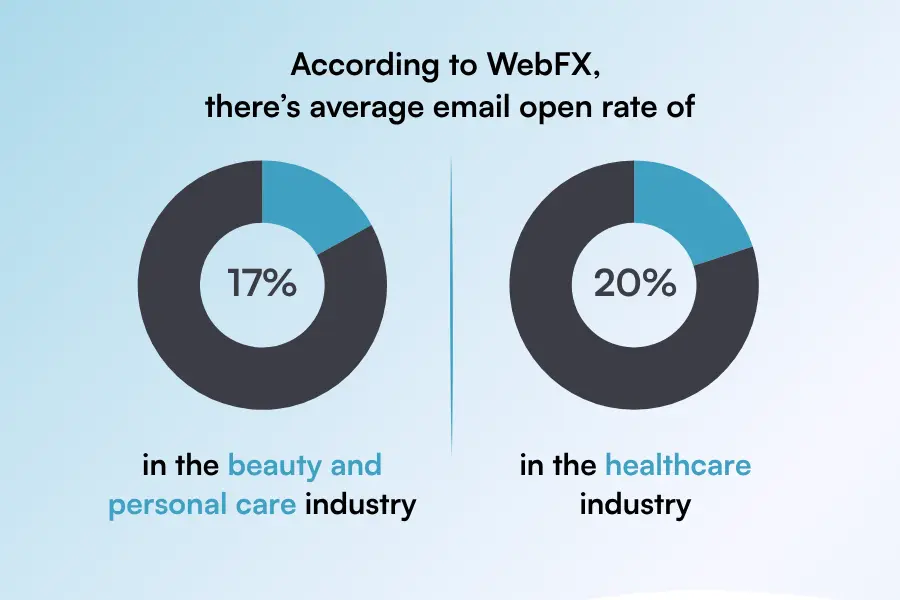According to WebFX the average open rate for the beauty and personal care industry is around 17%, while for the healthcare industry it is around 20%. But sending too frequently — especially without value — can lead to email fatigue.