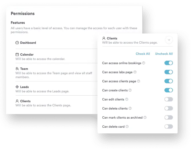 Pabau is built for med spas, clinics, and private practices, so you know it fits your world with role-based permission settings that make it easy to assign the right access to each role, whether that’s your front-of-house team or a medical director.