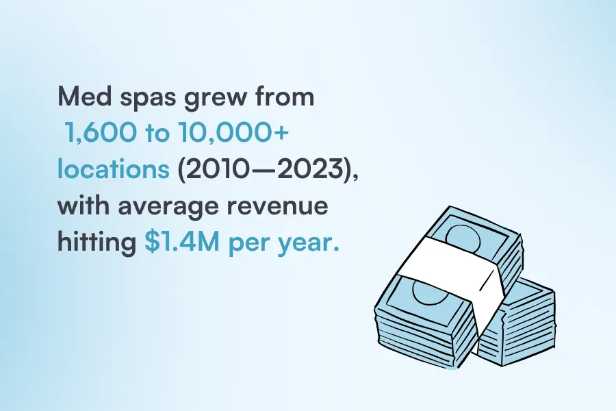 According to Baird, the number of med spas grew from 1,600 to over 10,000 between 2010 and 2023. During that time, average annual revenue more than doubled, reaching nearly $1.4 million per location. This shows just how fast the industry is growing and why it’s a strong opportunity today.