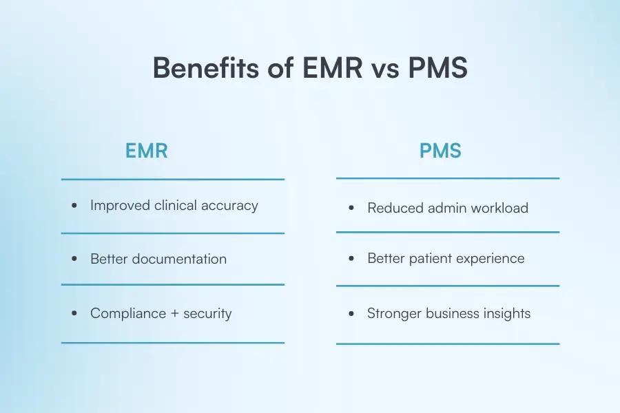 Key Takeaways Core purpose: A PMS manages the business side of a clinic (scheduling, billing, operations), while an EMR manages the clinical side (patient charts, documentation, medical records). Primary users: PMS tools are used mainly by front-desk and admin teams, whereas EMRs are built for clinicians delivering patient care. Data + workflows: PMS organizes appointments, payments, and daily operations; EMRs store and track clinical history, notes, treatments, and compliance documentation. How they work together: PMS keeps the clinic running smoothly, EMRs keep patient care consistent—most practices need both, or an all-in-one platform that combines them. If you’re comparing a practice management system vs EMR, here’s the quick answer you need: an EMR handles clinical documentation, while a PMS manages your daily operations. Most clinics benefit from using both because together they boost efficiency, reduce admin mistakes, and create a smoother patient flow.It’s not always obvious where these systems overlap or whether you’re better off integrating them, or choosing an all-in-one platform. So we’ll break it down with simple definitions and side-by-side comparisons to show exactly how each system works and how they differ.By the end, you’ll know which option fits your clinic best, including how platforms like Pabau combine both tools into one seamless, easy-to-manage solution. What is an electronic medical record (EMR)? An EMR is a digital version of a patient’s medical chart that stores clinical information such as history, diagnoses, and treatment notes. It helps providers document care accurately and securely, replacing paper records with a centralized, searchable, digital system. What is practice management software (PMS)? Practice management software is a system that streamlines the administrative side of a clinic, handling tasks like scheduling, billing, and daily operations. It helps practices run efficiently by automating routine workflow processes and centralizing key business functions in one place. Key differences between EMR and PMS Feature differences between EMR and PMS Now that we’ve covered the big-picture differences, let’s look at how EMRs and PMS platforms differ in what they actually do. EMRs focus on clinical care, while PMS systems keep the business side running smoothly.EMR featuresClinical documentation like SOAP notes and treatment plansE-prescribing and lab integrationsSecure chart storageClinical compliance toolsPMS featuresScheduling and online bookingPayments, invoicing, and POSMarketing and retention toolsReporting and business analyticsStaff and resource managementPatient communication and remindersClinical vs. administrativeWhat it meansEMRs support the clinical side of your practice, while PMS tools manage the administrative and operational side.EMR focuses on:Recording medical histories and treatment notesSupporting clinical decision-makingKeeping health records accurate and accessiblePMS focuses on:Scheduling, reminders, and patient communicationBilling, invoicing, and day-to-day operationsImproving efficiency at reception and backend adminWhy it mattersWhen these systems work well together, you reduce errors, eliminate double work, and give patients a smoother experience.Who uses itEMR: Providers, clinicians, nurses, aestheticiansPMS: Receptionists, admin staff, practice managersPatient health information vs. practice operationsWhat it meansThe information stored in each system is completely different — clinical data vs business data.EMR holds:Symptoms, diagnoses, and test resultsPast treatments, notes, and medical historiesIntake forms, consent forms, patch testsPMS holds:Appointment slots, reminders, recallsFinancial records, invoices, revenue reportsPatient communications and follow-upsWhy it mattersKeeping these data types separated (but connected) prevents mix-ups and protects patient safety while still powering efficient operations.Who uses itEMR: clinical teamsPMS: operations & front deskIntegration and interoperabilityWhat it meansEMRs are often built to integrate with external healthcare systems (labs, hospitals, specialists). PMS tools focus more on keeping your internal workflows running smoothly.EMR interoperability may include:Lab integrationsSecure data sharingCentralized clinical record-keepingPMS interoperability focuses on:Working well within a single practiceConnecting scheduling, payments, and admin toolsWhy it mattersIf your EMR and PMS don’t communicate, your team ends up double-entering data which is a major cause of errors and lost time.💡 Curious how a single platform can replace multiple systems? Book a quick demo of Pabau and see how simple managing your clinic can be.Healthcare providers vs. administrative staffWhat it meansDifferent teams rely on different systems, depending on their day-to-day responsibilities.EMR users:Doctors, nurses, aestheticiansAnyone documenting or reviewing clinical dataPMS users:Reception teamsFront-of-house staffPractice managersWhy it mattersChoosing software that supports both groups prevents bottlenecks and ensures your entire clinic works in sync.Compliance and regulationWhat it meansEMRs carry stricter medical compliance requirements because they manage PHI (protected health information). PMS tools must meet broader data, financial, and privacy standards.EMR compliance may include:HIPAAHITECHMedical data security controlsPMS compliance may include:GDPRICD-10 and coding standardsPCI DSS for secure payment processingWhy it mattersA system that handles both clinical and operational workflows needs to meet all relevant security and regulatory standards, or otherwise your practice is exposed to risk. Benefits of practice management systems and EMRs Both EMRs and PMS tools streamline the way clinics operate, but each supports a different part of the patient journey. EMRs improve quality of care through better clinical documentation and accuracy, while PMS tools boost effic