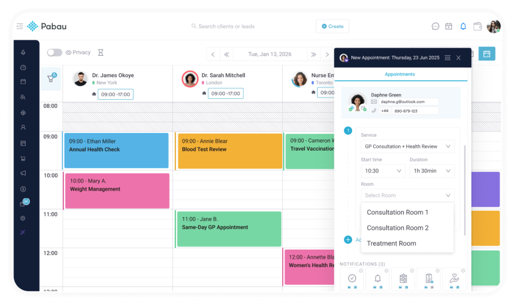 - Multi-location operations: Centralised calendar system managing appointments, staff scheduling, and resource allocation across multiple clinic sites with role-based access controls