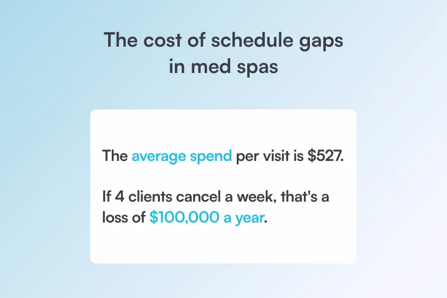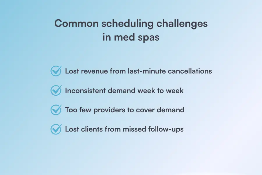 Many med spas can easily fill their schedules. The real test is what happens when plans shift, which they inevitably do.A regular client might want to reschedule their appointment, or someone might cancel unexpectedly. Just as easily, you could find yourself flooded with new requests out of the blue.A waitlist keeps you ready for all of it. It shows clients you’re organized and makes your operations feel effortless, even when things don’t go as planned.In this guide, you’ll learn how to manage your waitlist more strategically, spot patterns in your schedule, keep your bookings steady, and make clients feel like they’re always your first priority. Why waitlist management matters more than ever for med spas These days, clients expect flexibility. If your med spa can’t offer quicker access or handle scheduling changes without a hitch, they’ll notice, and they won’t be shy about booking elsewhere next time.A well-run waitlist has become one of the simplest ways to stay ahead. It helps you:Protect the revenue you’ve planned forCreate a smoother client experienceMake sure every opening finds the right personA 2025 Mayo Clinic study tracking 229,998 appointments found that automated waitlists helped 24.6% of patients secure earlier slots, rescheduling an average of 22.6 days sooner. Illustration: Pabau / Data: PubMed The study also found that when clients could choose to accept or skip earlier slots themselves, scheduling ran more smoothly and wait times dropped.To keep this level of consistency going, you need tools that take the manual work off your plate. 💡 Pabau’s all-in-one practice management software handles everything from automated reminders to follow-ups. So instead of shuffling papers or chasing no-shows, your team can spend more time making clients glad they chose you. Common scheduling challenges facing med spas On paper, it all looks simple enough. Clients book appointments, show up on time, and the day moves along. In practice, though, one change can set off a chain reaction that throws your schedule off balance.These are some of the most common challenges you’ll run into. ⬇️ Illustration: Pabau Let’s take a closer look at how each one can impact your business:Last-minute cancellations. A regular calls to cancel, and you’re left with an hour you can’t bill.Booking rushes that come and go. Right before the holidays, everyone wants in. A week later, your phones go quiet.Too few providers to cover demand. Poor staff management can leave your schedule vulnerable when someone calls out, forcing the rest of the team to pick up the slack.Follow-up that slips through the cracks. Without consistent reminders or rebooking, even your best clients eventually wander off to someone else.A waitlist won’t prevent every problem, but it helps you recover faster when the schedule takes a turn. The hidden cost of gaps in the calendar You don’t need a finance degree to see how unfilled slots drain your profitability over time.The American Med Spa Association’s 2024 report puts the average visit at $527. Miss four a week, and that’s over $100,000 gone by year’s end. Illustration: Pabau / Data: AmSpa Multiply that across a couple of treatment rooms or locations, and the numbers get uncomfortably big. Even the best marketing or social media presence in the world can’t cover for a schedule that doesn’t have a plan to fill those gaps.This is exactly why strategic waitlist management pays for itself many times over. What is waitlist management (and what makes it strategic)? A waitlist usually starts as a list of names. Someone calls to book, you’re full, so you take their details and promise to reach out if a spot opens up.Waitlist management takes that simple idea and turns it into a reliable system. Instead of hoping you’ll remember to follow up, you have a clear process to track interest, keep clients informed, and fill appointments before they go to waste.Good med spa software makes it easier to stay organized without relying on memory or last-minute calls. It helps you:✔️ See who’s waiting, what treatments they want, and when they’re available✔️ Match open slots to the right clients quickly✔️ Send notifications as soon as a slot appears✔️ Keep everything tidy, current, and paper-free 💡 Pro tip: When managing your waitlist and client information, remember that HIPAA compliance isn’t just a checkbox. Make sure your med spa software offers granular user permissions that restrict access to sensitive client data. This keeps your practice secure and builds trust with clients who expect their information to be handled with care. Passive vs. proactive waitlists A passive waitlist is the old-school approach. You jot down names in a notebook or keep a spreadsheet that only gets updated when someone has a spare minute. It can work for a while, but as soon as your schedule fills up, it’s easy for clients to be overlooked or kept waiting too long.A proactive system keeps you a step ahead. With dynamic medical spa software like Pabau, every request is saved and easy to find. When a slot opens, clients get a heads-up right away. They can book it themselves, or your team can confirm in just a few clicks.Here’s a peek at how it looks in the dashboard. 👀 Source: Pabau Everything is right there on the screen, clear and organized. You can see:✔️ Who’s waiting✔️ Which services they want✔️ Their preferred time slots and practitioners✔️ How long they’ve been on the waitlistIt’s a smarter way to keep your team and your clients on the same page. Strategic benefits beyond filling cancellations A smart waitlist is a practical, strategic tool that does more than keep your schedule full. Here are a few benefits you’ll see when you put it to work:👉 Improve client satisfaction and retentionPeople remember when you offer them an earlier spot. Even if they don’t take it, the gesture feels genuine. That small touch is what k