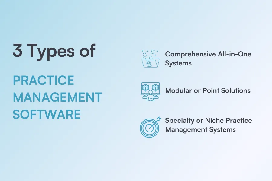 There are different types of practice management systems, including all-in-one platforms, modular tools, and specialty systems, each suited to different clinic needs.