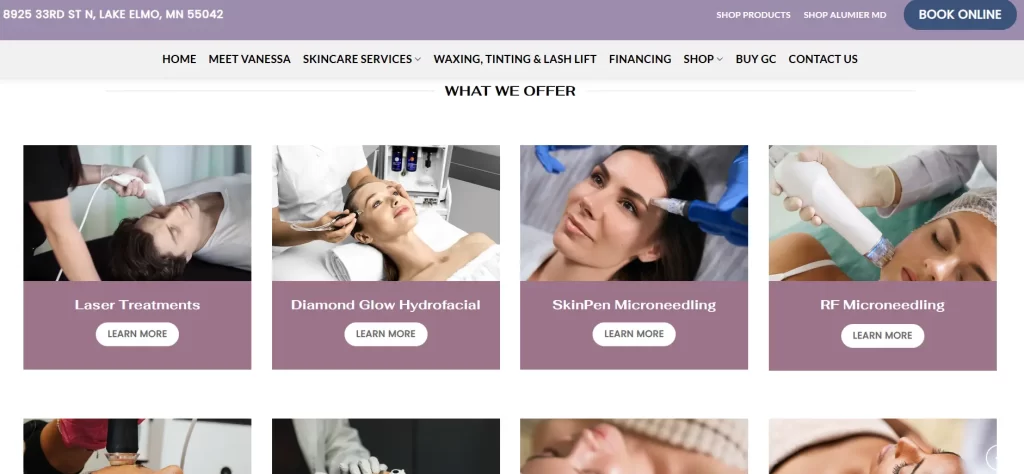 A menu like this one will never hook clients into checking out what services the med spa offers, nor would it trigger them to book. Everything that’s displayed is very uncreative and disorganized.