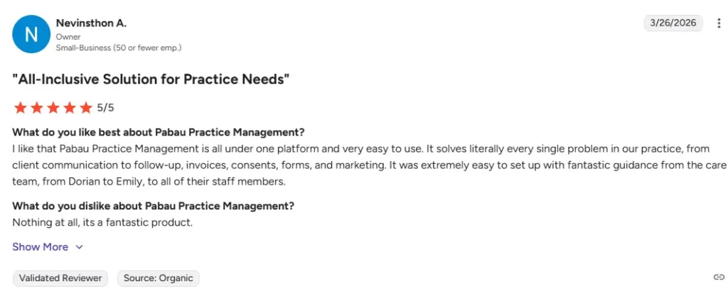 Pabau’s depth creates an onboarding curve. Practices moving from simpler tools report that configuring clinical forms, treatment protocols, and automated workflows takes time – though dedicated onboarding support reduces this friction significantly. Some users note that the mobile app, while functional, could offer greater feature parity with the desktop interface. As with any comprehensive platform, teams that invest in setup and training get materially better outcomes than those who approach it as a plug-and-play tool.