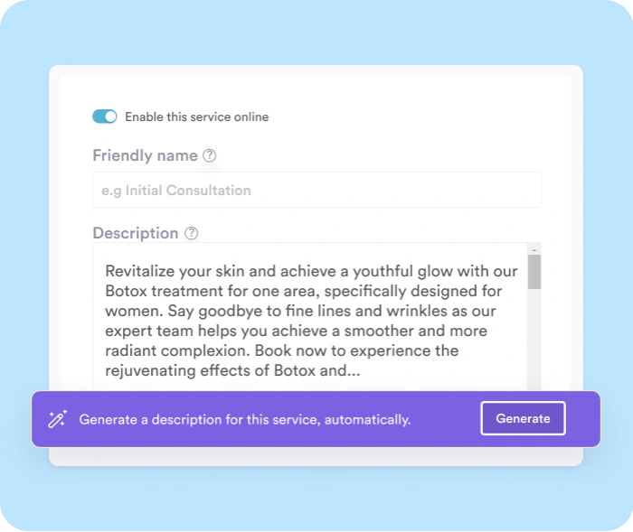 Professional, on-brand treatment and product descriptions — generated in seconds.