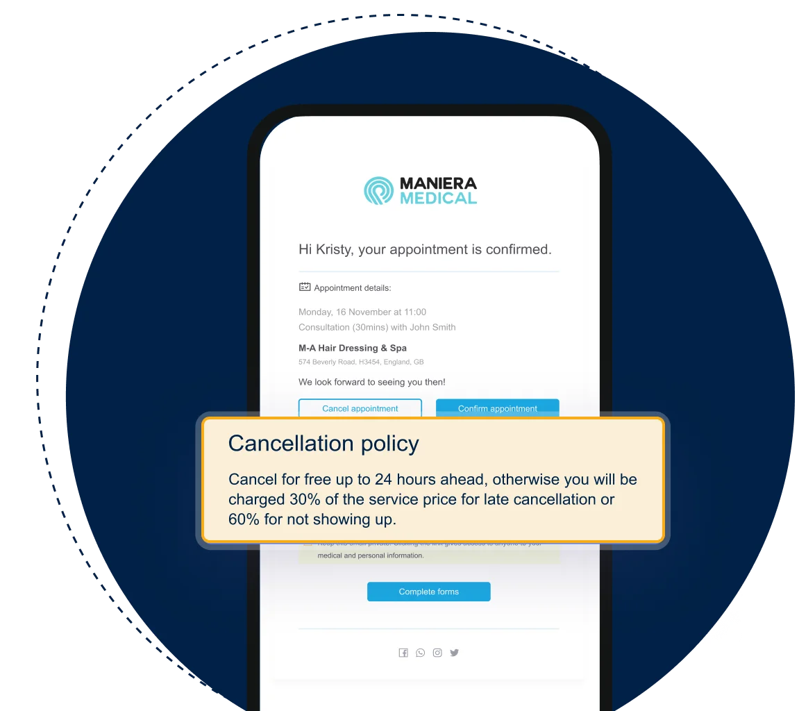 Clients are informed about the policy through appointment confirmations and reminders sent via email or SMS. You can also include the policy details on your clinic’s website, online bookings and in any client communication materials.