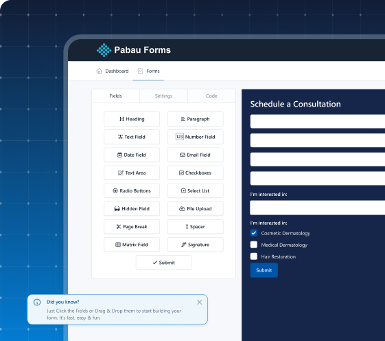 Collect the information you need, your way. Design forms that match your brand and workflows, publish them anywhere — from websites and landing pages to booking pages or emails — and instantly capture submissions in Pabau. Perfect for lead generation or client intake.