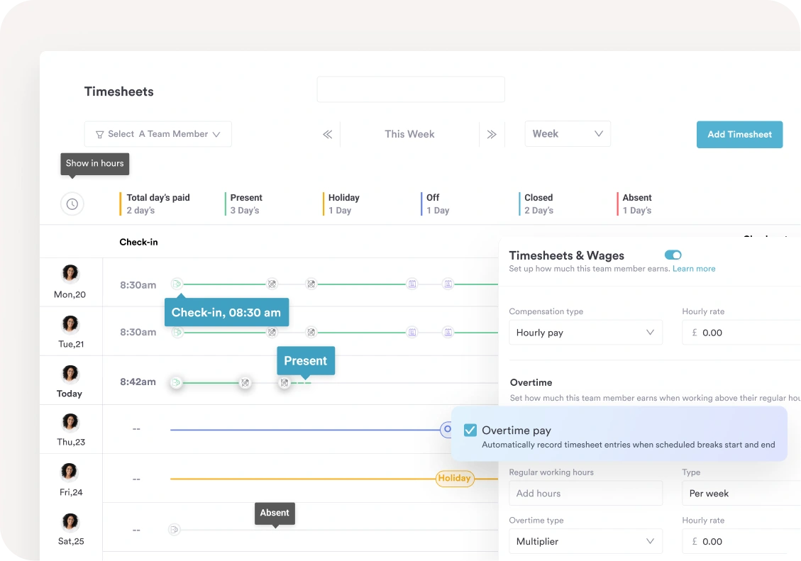 Staff can clock in and out with a single click from any location, and the timer keeps accurate track of hours worked, including breaks.