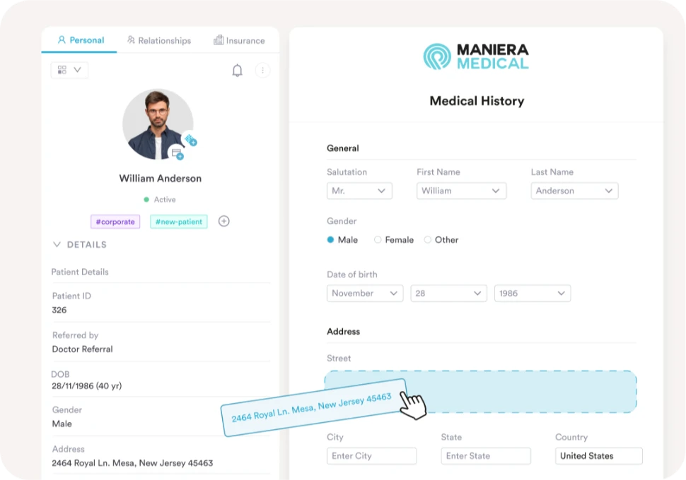 Digital intake eliminates manual data entry, automates patient onboarding, and uses automated internal workflows to sync patient records directly with Electronic Health Records and practice management software.