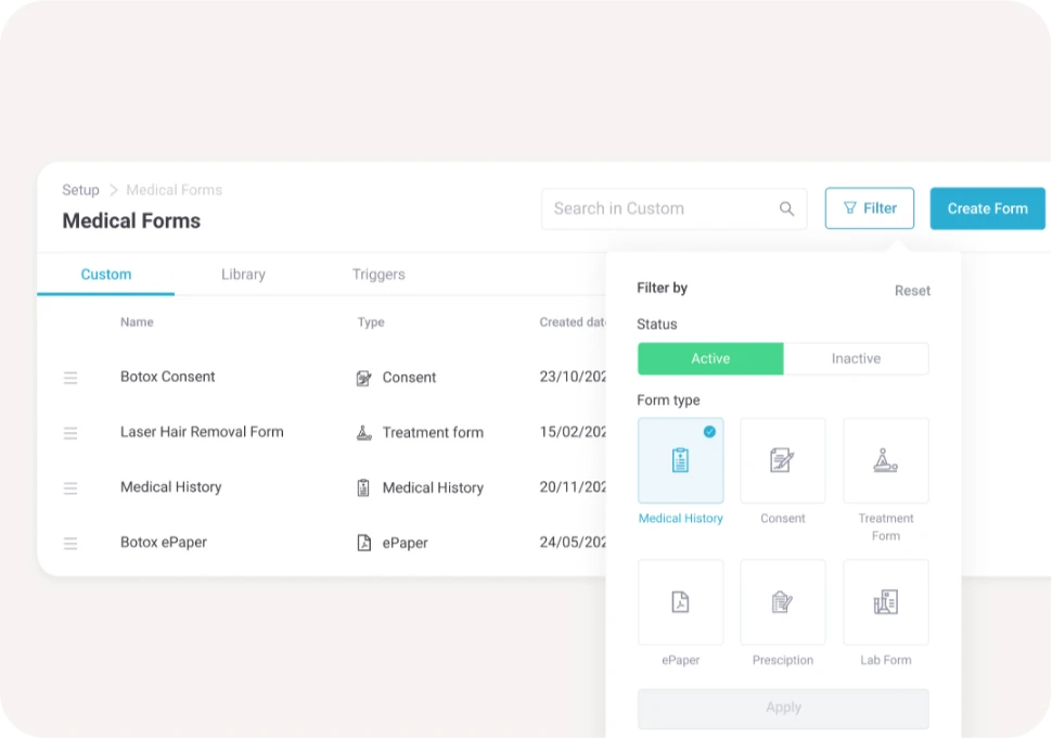 Create digital forms for every stage — patient intake, consultations, consent, and follow-ups — all tailored to your clinic.