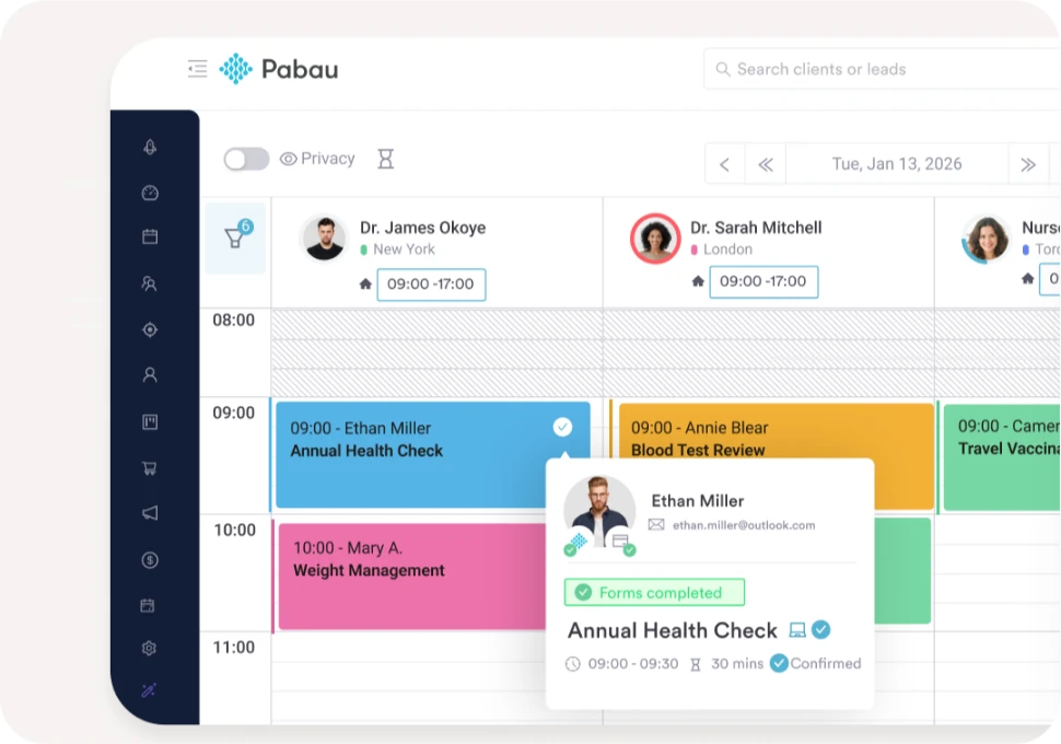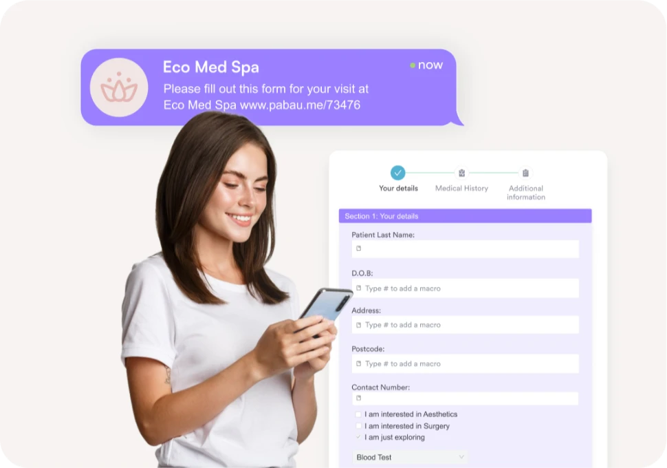 Collect intake forms, consent, and medical history before clients arrive — all digital, all paperless, with patient intake software built inside Pabau.