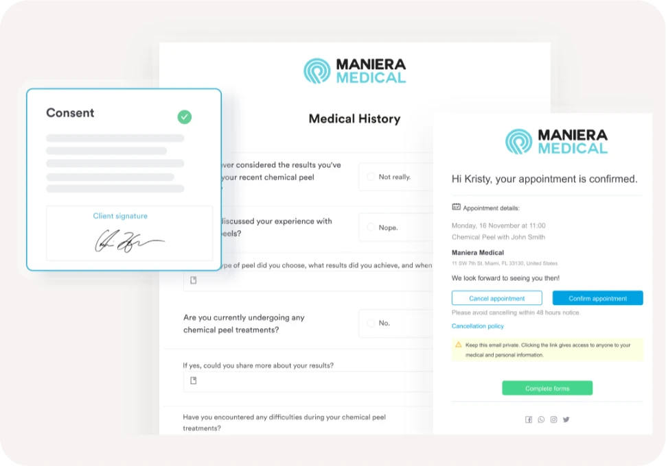 Clients can complete forms at home through the patient portal or via a secure link, so they can arrive prepared and ready for their treatment.