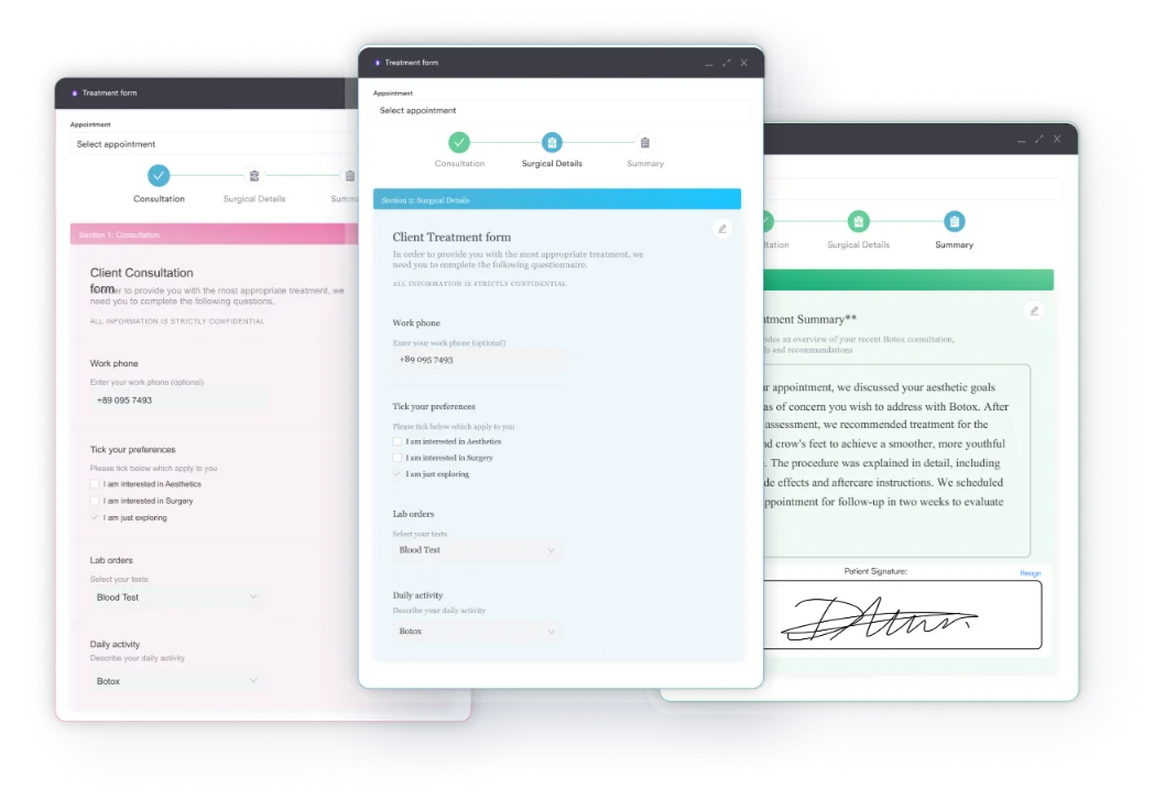Collect everything you need before an appointment with automated digital consent and intake forms. You can qualify clients before they arrive and even run shorter appointments (as everything is filled out in advance).