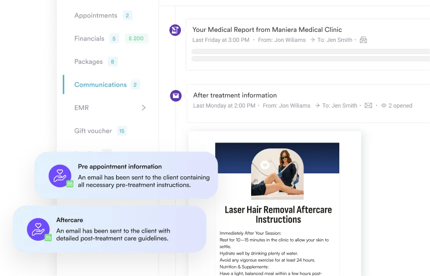 Pre- and post-treatment care guidance goes out automatically, improving adherence and results without the manual chase.