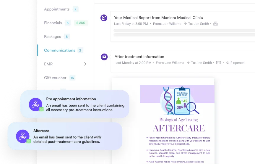 Pabau has a full in-built EMR for managing patient records. All patient information—from medical history forms and treatment notes to communications—is stored digitally. A single client card acts as a hub so staff can access a patient’s demographics, medical record, and any notes or communications with one click.