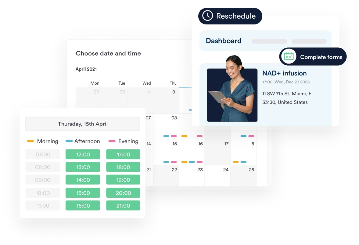 Patients book, reschedule, and pay deposits online anytime with real-time availability and completed intake forms before arrival. Your calendar fills itself while your front desk stops playing phone tag.
