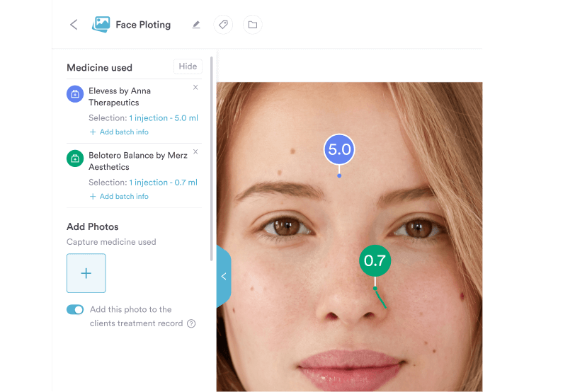 Map every injection point with injection details on the client record so practitioners can see exactly where treatments have been done and support multi-session treatments accurately.