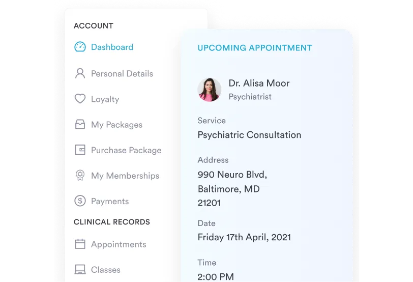 The client portal lets patients view upcoming appointments, complete forms, and access their treatment history — reducing phone calls and improving patient engagement.