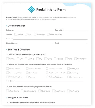 Streamline client onboarding with a detailed facial intake form that covers all essential skincare info.